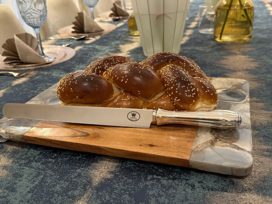 סכין חלה יוקרתית מבית בראשית יודאיקה, מצופה כסף טהור 999.